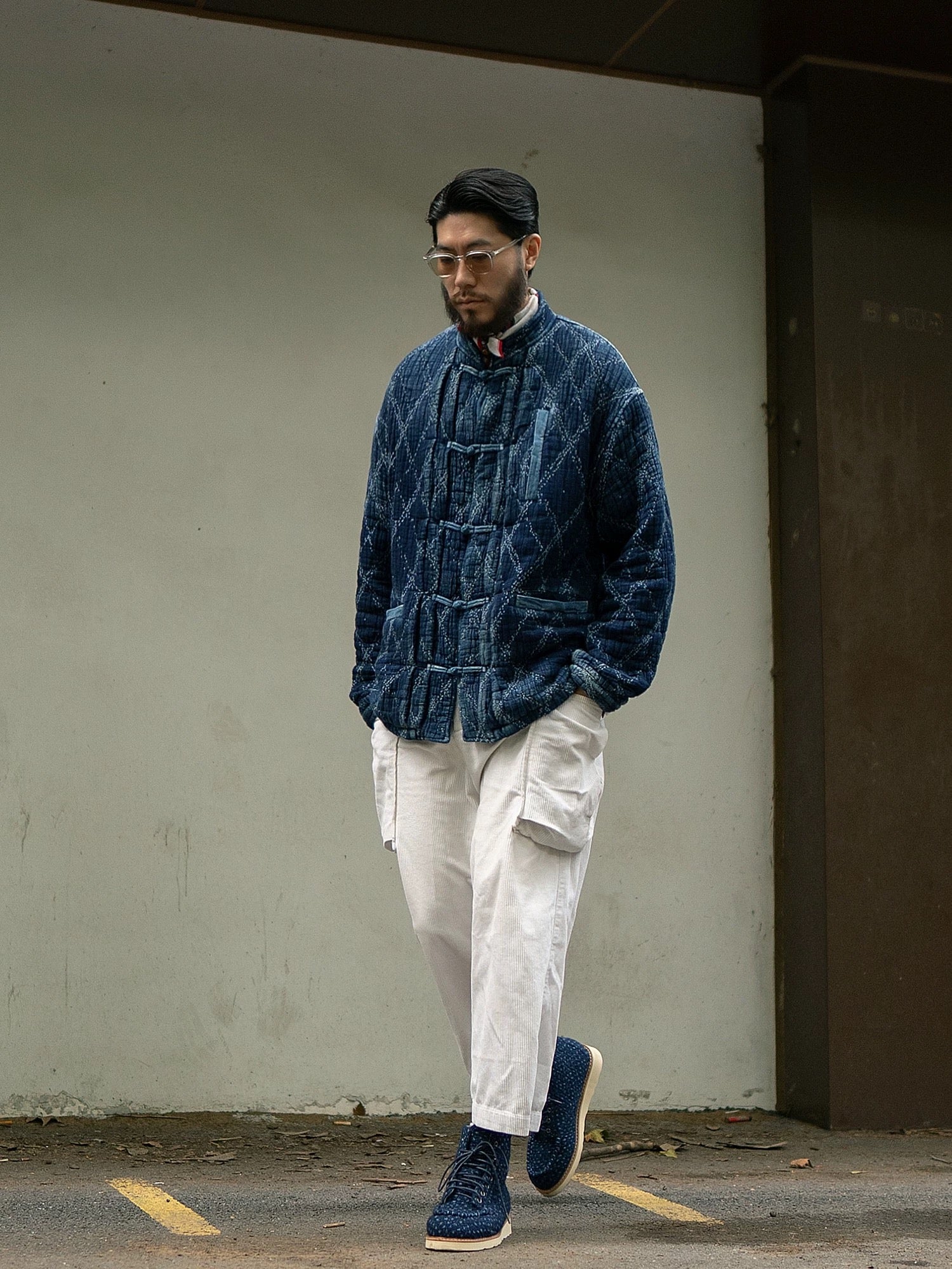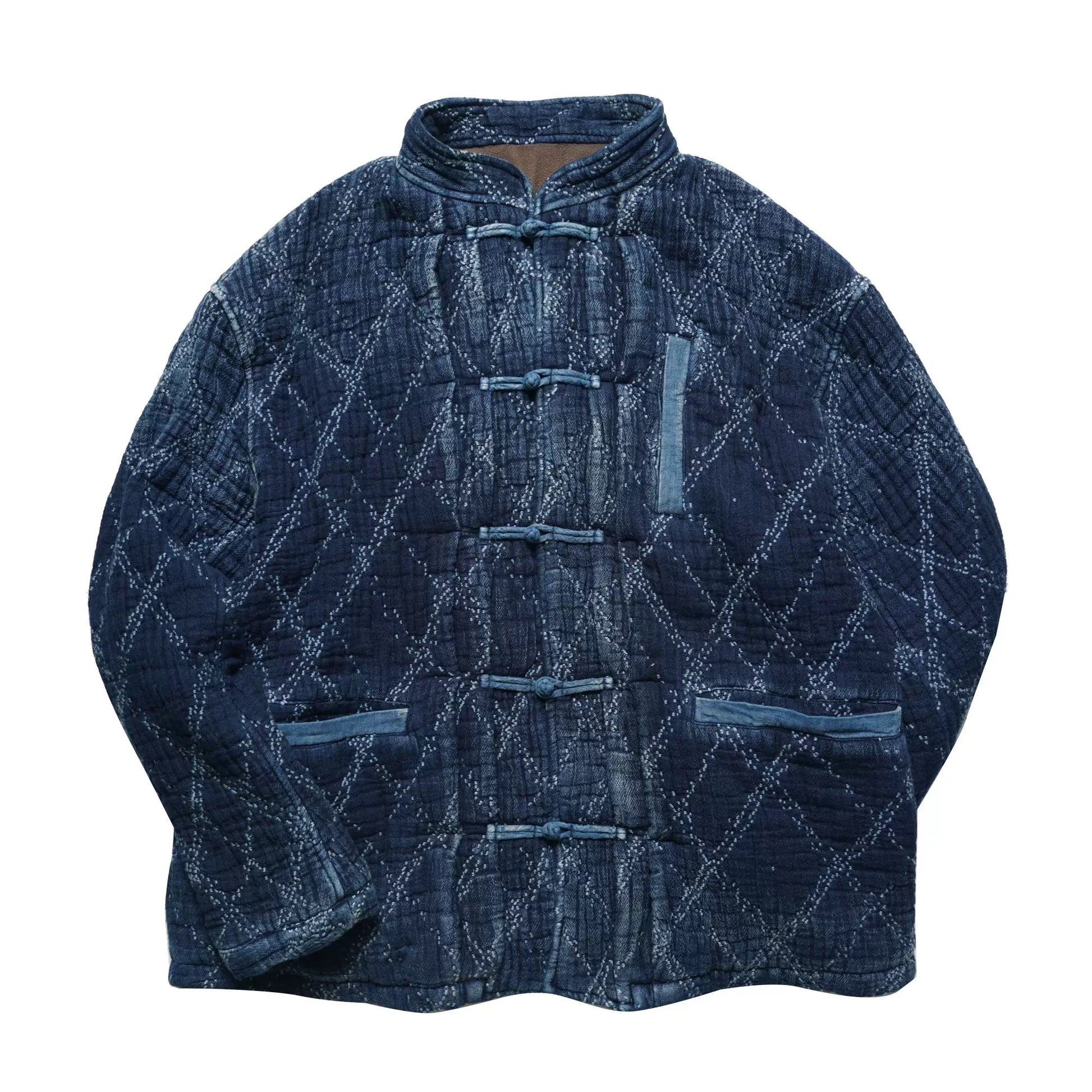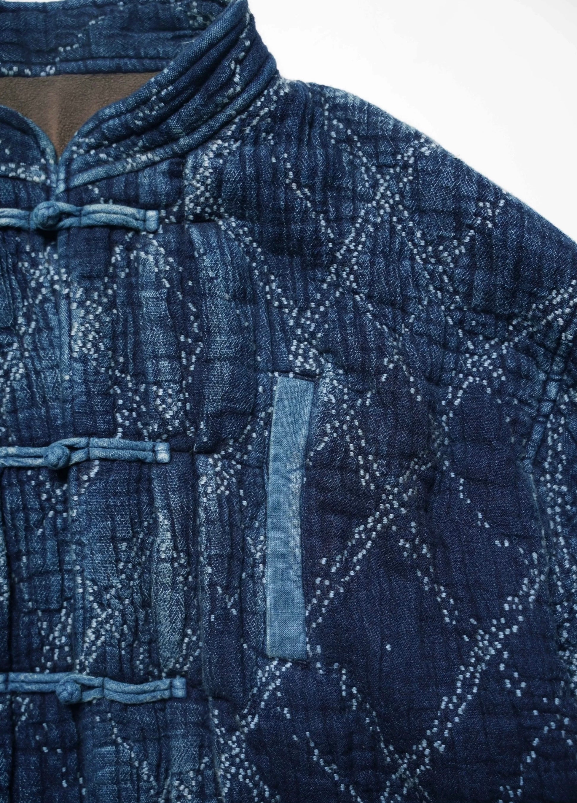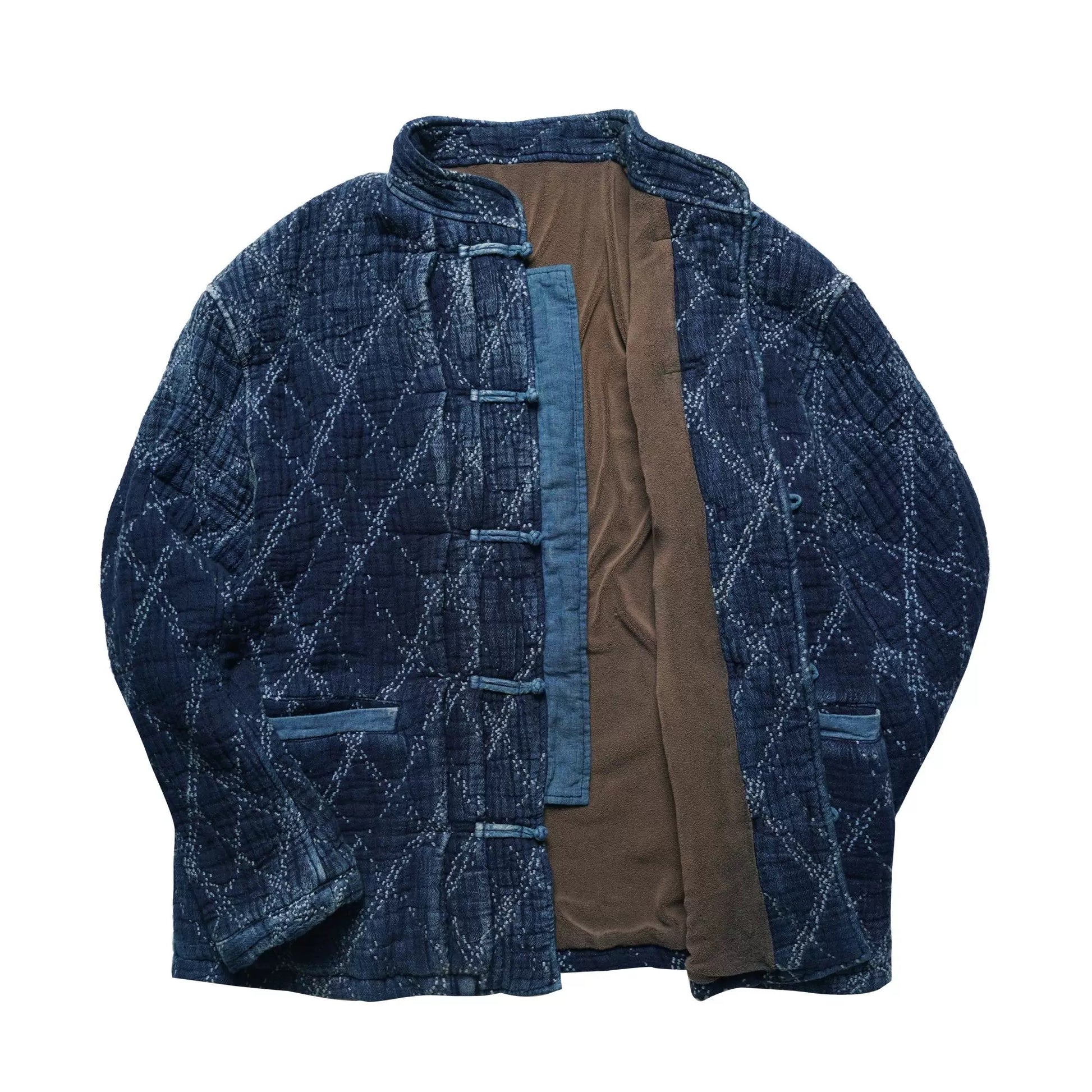 Indigo Dye Heavyweight Checked Sashiko Chinese Coat