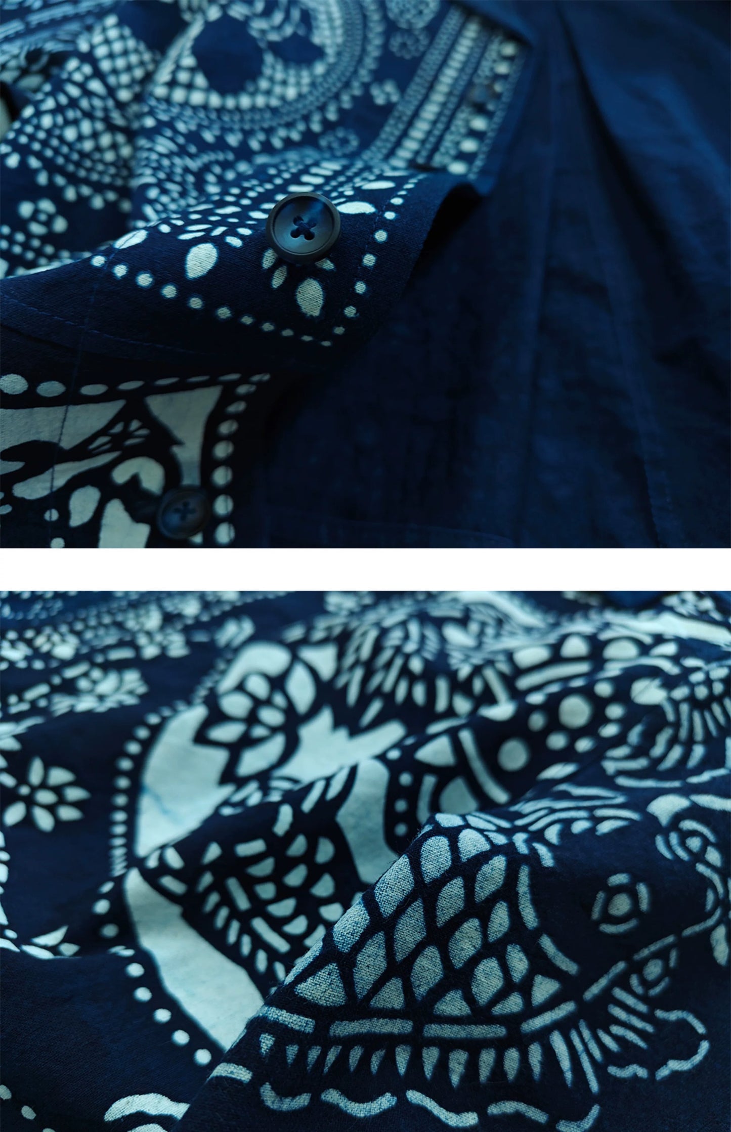 Nature-Inspired Patchwork: The shirt is adorned with a patchwork of nature-inspired patterns, including detailed koi and crane designs. These motifs are meticulously crafted to bring a touch of nature's beauty to your wardrobe.