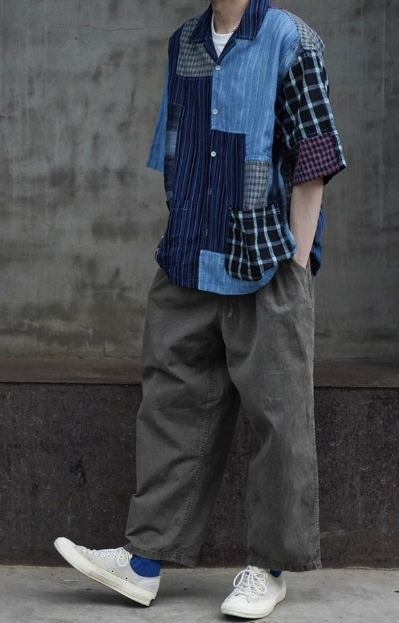 The "Indigo Dye Patchwork Aloha Shirt" is a truly distinctive piece, designed with an intricate blend of artistry and craftsmanship. This shirt is crafted using various fabrics meticulously stitched together in a patchwork pattern, creating a textured and visually captivating design. The patchwork technique involves selecting different types of fabrics, each adding its own unique texture and character to the shirt.