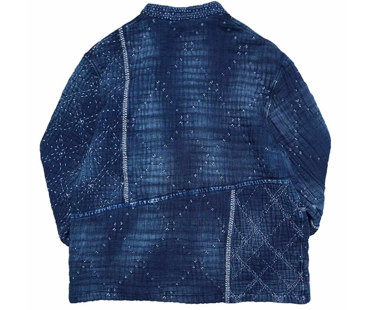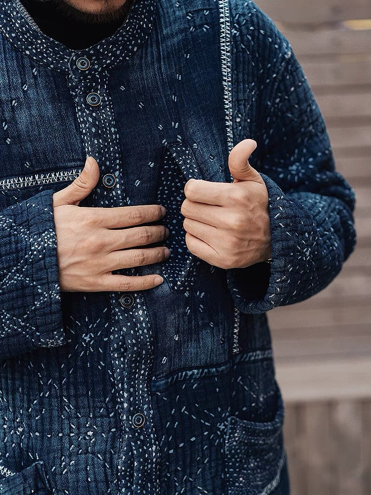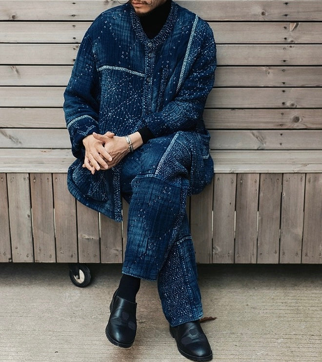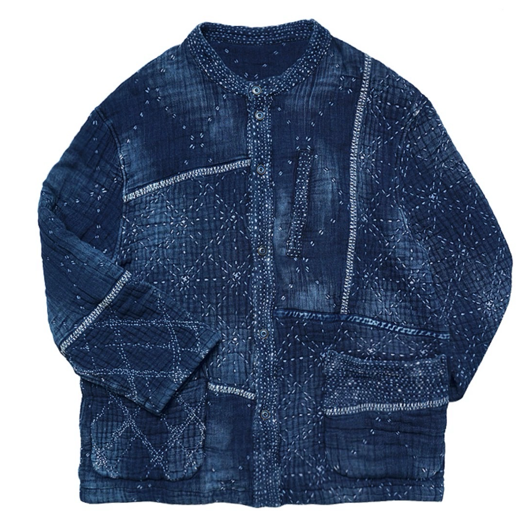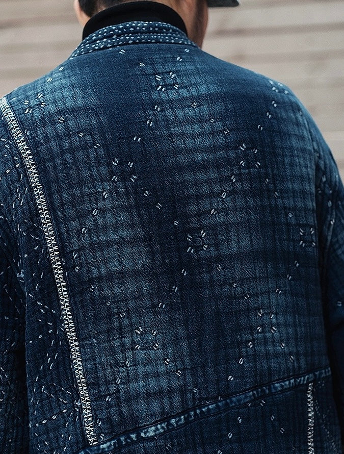 Indigo Dye Patchwork Sashiko Heavyweight Collarless Coat