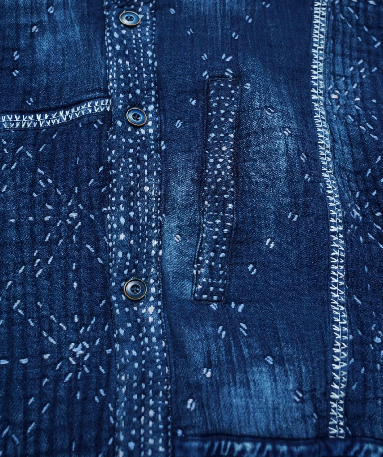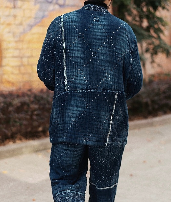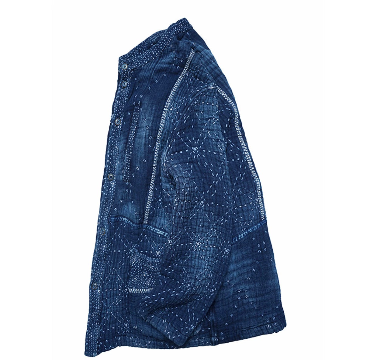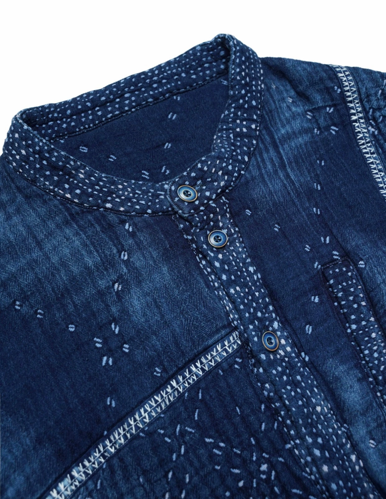 Indigo Dye Patchwork Sashiko Heavyweight Collarless Coat
