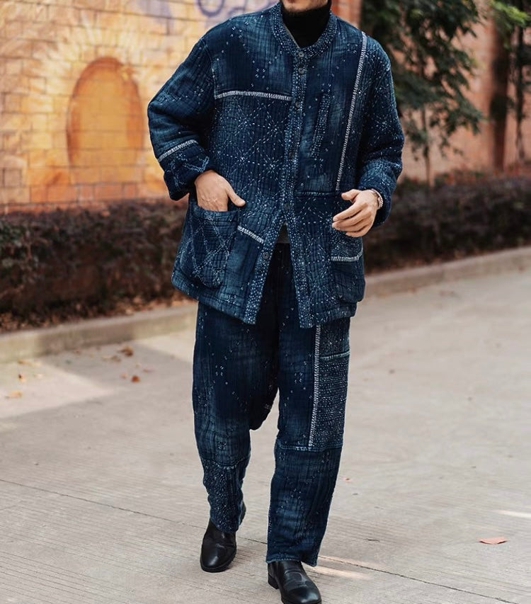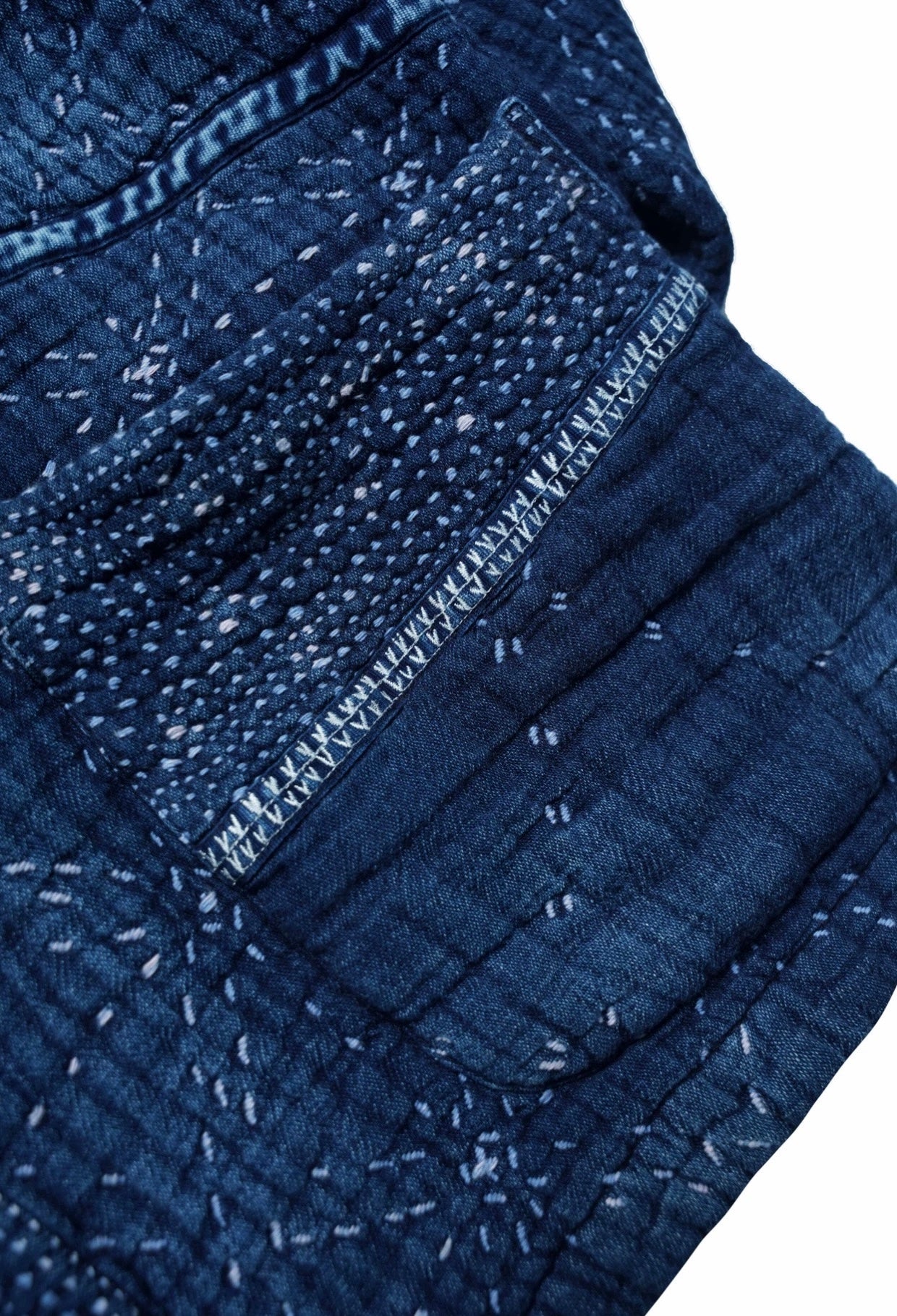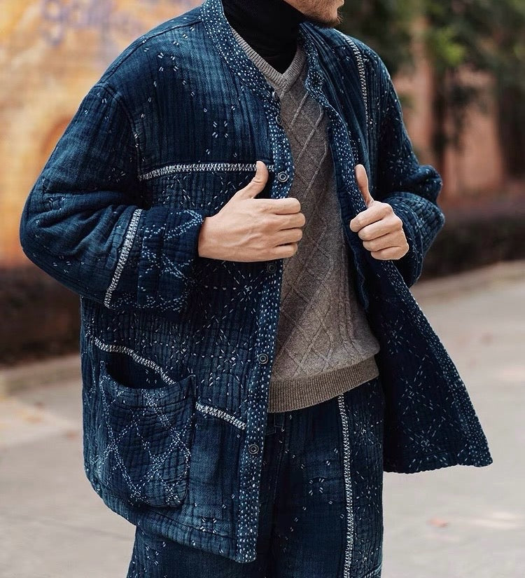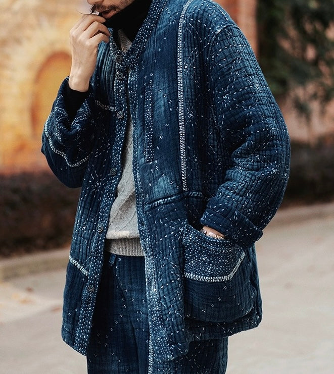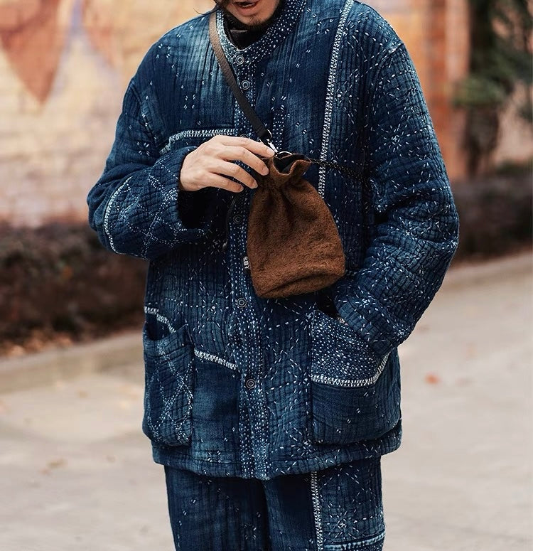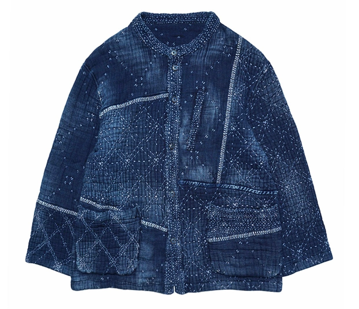 Indigo Dye Patchwork Sashiko Heavyweight Collarless Coat