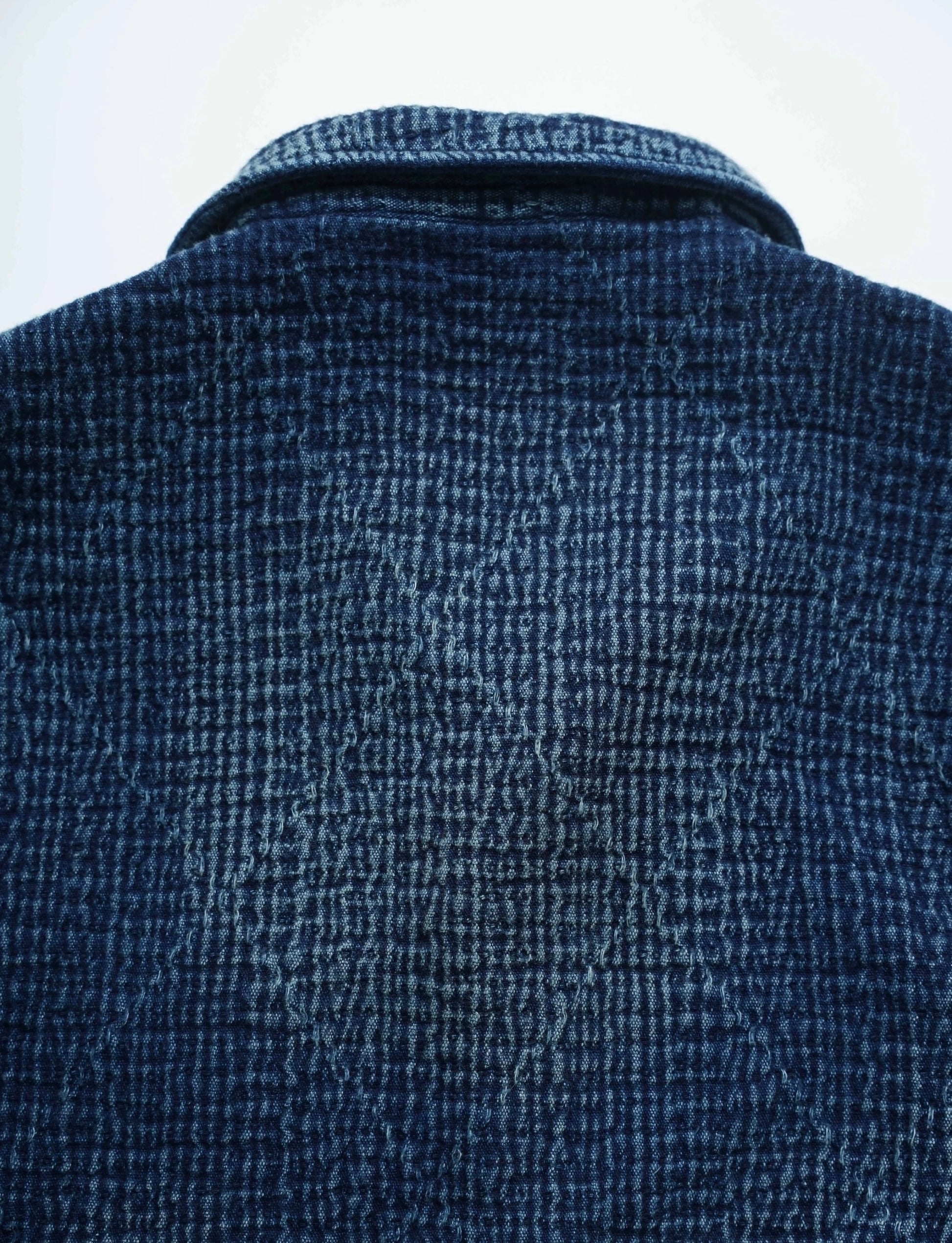 Crafted from high-quality sashiko fabric, the jacket features intricate hand-embroidered stitching, meticulously dyed using natural indigo. This process gives the embroidery a distinct depth and character, showcasing the beauty of handcrafted details.