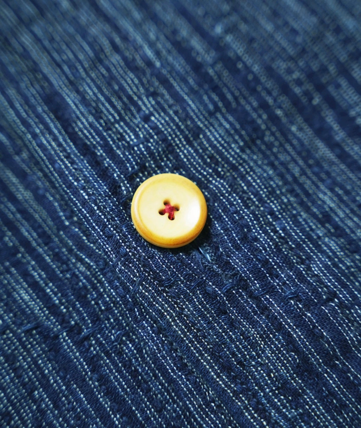 Fabric and Craftsmanship: Crafted from high-quality sashiko fabric, this shirt showcases the intricate Japanese weaving technique known for its durability and rich texture. The indigo dyeing process further enhances the fabric, giving it a deep, vibrant color that only gets better with time. The sashiko stitching not only adds visual interest but also reinforces the fabric, making it robust and long-lasting.