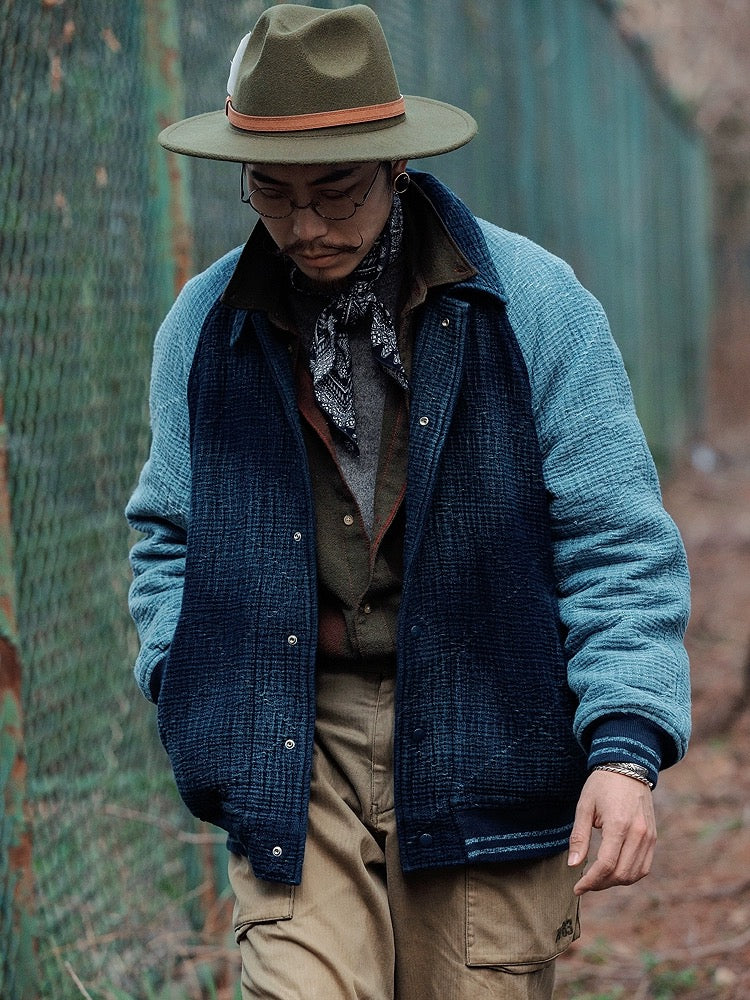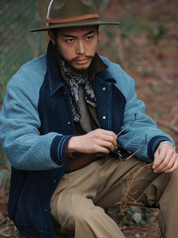 Style and Versatility: The Indigo Dye Sashiko Two Tone Baseball Jacket is versatile, perfect for those who want to stand out with a unique look. Its combination of classic baseball jacket styling and traditional Japanese elements makes it suitable for various occasions. Whether paired with jeans for a casual day out or layered over a shirt for a more polished appearance, this jacket adapts effortlessly to different styles.