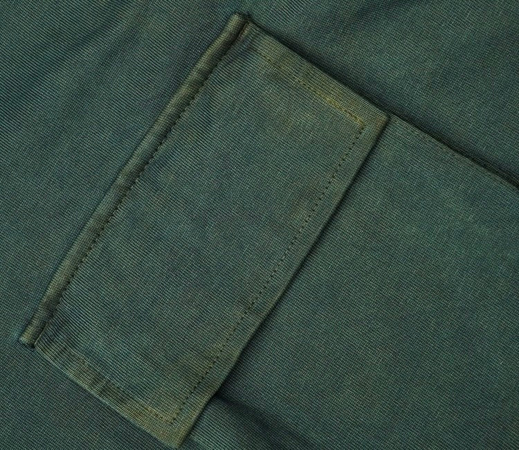 This unique T-shirt is crafted from 330g high-quality cotton, offering both durability and comfort. The fabric undergoes a meticulous dyeing process, starting with oak leaves, which are applied ten times to create a rich, natural base. To achieve a distinctive green hue, reminiscent of nature and earth, the fabric is then dyed once with indigo. The result is a beautiful blend of green, with the earthy tones of mud dye, and a retro aesthetic that gives this T-shirt a timeless appeal.