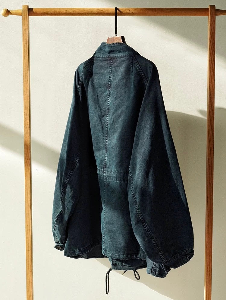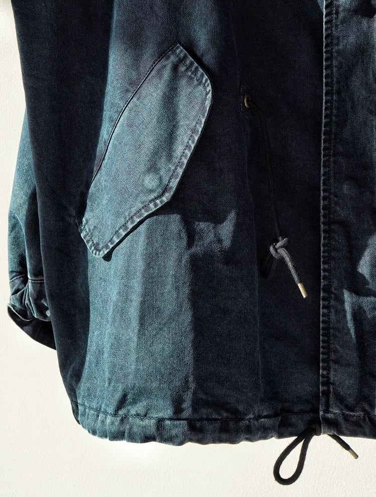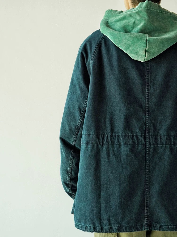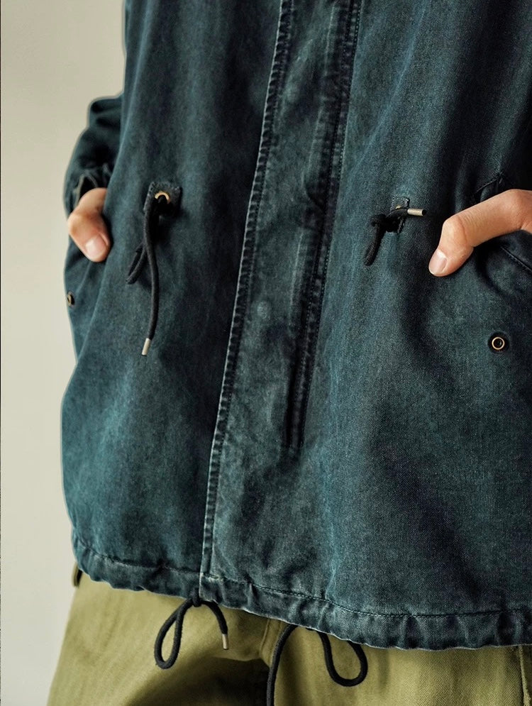 The Organic Plant Dye Washed Short M65 Parka is crafted from high-quality, 100% cotton, providing both comfort and breathability. Its distinctive color comes from a natural dyeing process: first, a rich brown shade is created using organic walnut shell dye, then layered with indigo to achieve a deep, dark blue. This unique dye technique gives the parka a layered color effect that subtly changes with each wash, enhancing its vintage look over time.